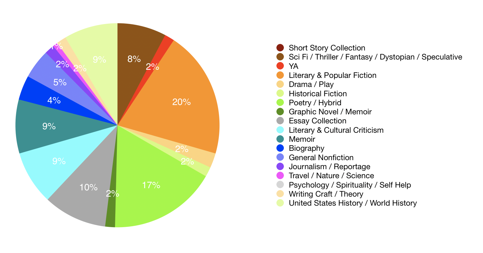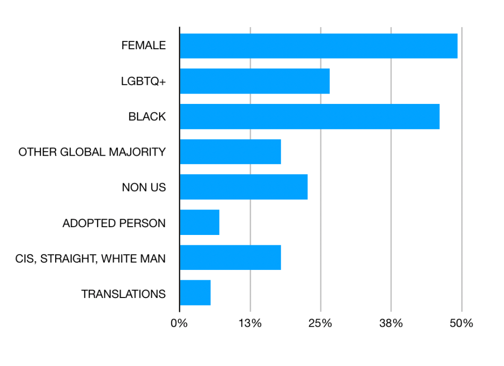 64% of books were by authors of color (46% Black and 18% other authors of color), 49% identified as women, 27% were LGBTQ, 23% were born outside of the US, and 7% were adopted persons. 5% were English translations.