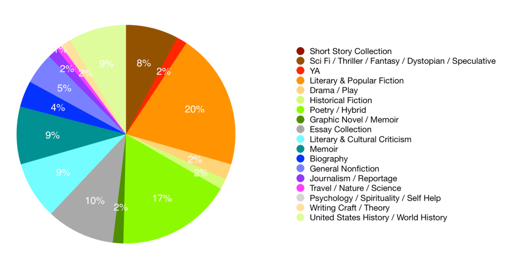 I read 128 books in 2024 across 18 sub-genres in fiction (33%), non-fiction (49%), and poetry/hybrid (18%).